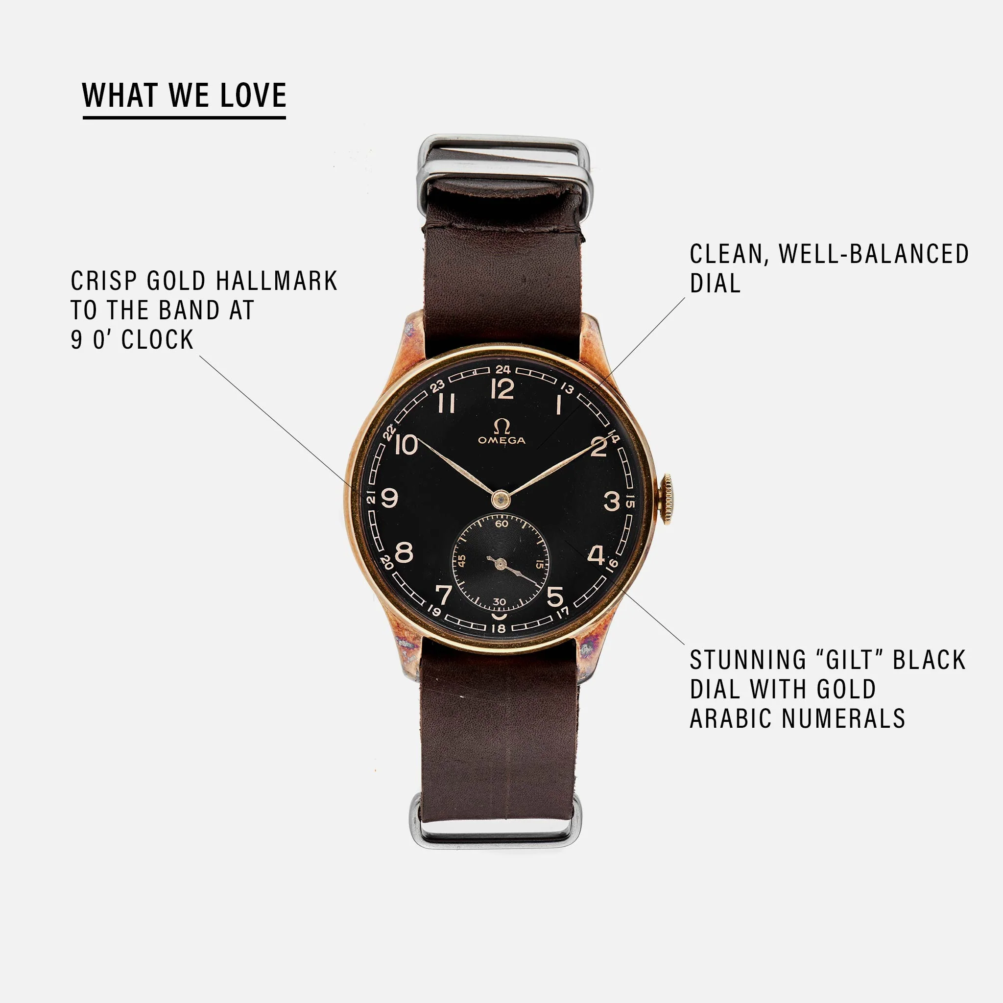 With its 36mm, 14k yellow-gold case and black gilt dial, this Omega stands out from the rest. Quite crazy to think that it was made in the 1930s...