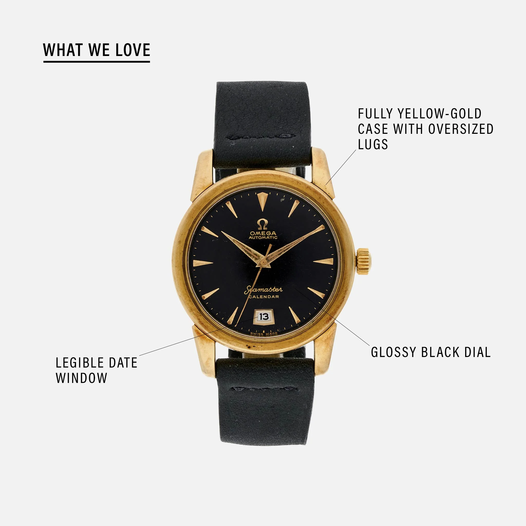 This watch has many things going for it. First of all, it’s a Seamaster, one of the leading lines of Omega – a brand that focused on producing resilient watches. The large yellow-gold case with oversized lugs forms a killer combo with the slick black dial – the type we love in vintage watches. This is the perfect dress watch and it's practical, thanks to the calendar complication of the automatic caliber 355 with bumper rotor. The positioning of a date window is sometimes controversial, but here at 6 o'clock it works out very nicely.