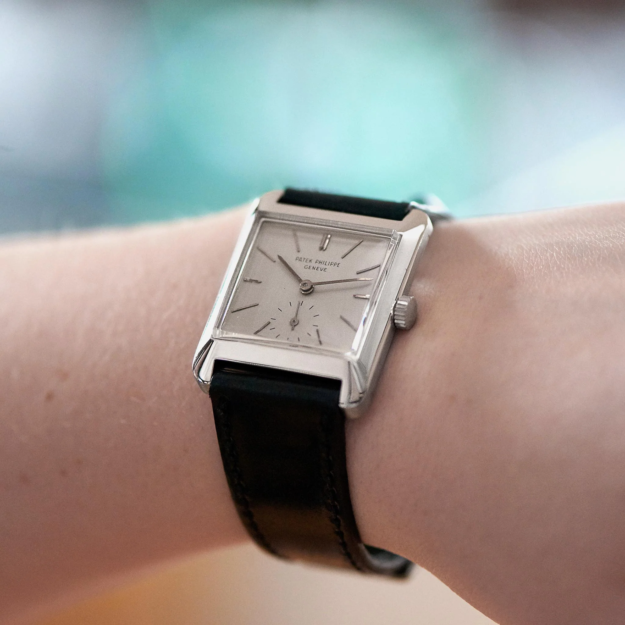 The subtle sheen of the case doesn’t lie: this quietly handsome Patek Philippe wristwatch from the 1950s is cased in platinum, and it’s a great example of everything that made the watchmaking of Patek so revered.