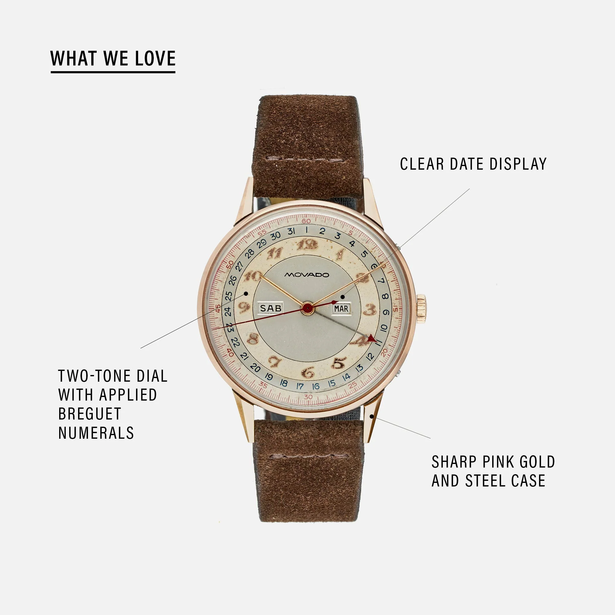 This Movado "Calendograph" has all the elements of a great vintage watch: pink-gold case, sharp faceted lugs, triple-date complication, two-tone dial, and Breguet numerals. All this for less than $3,000.