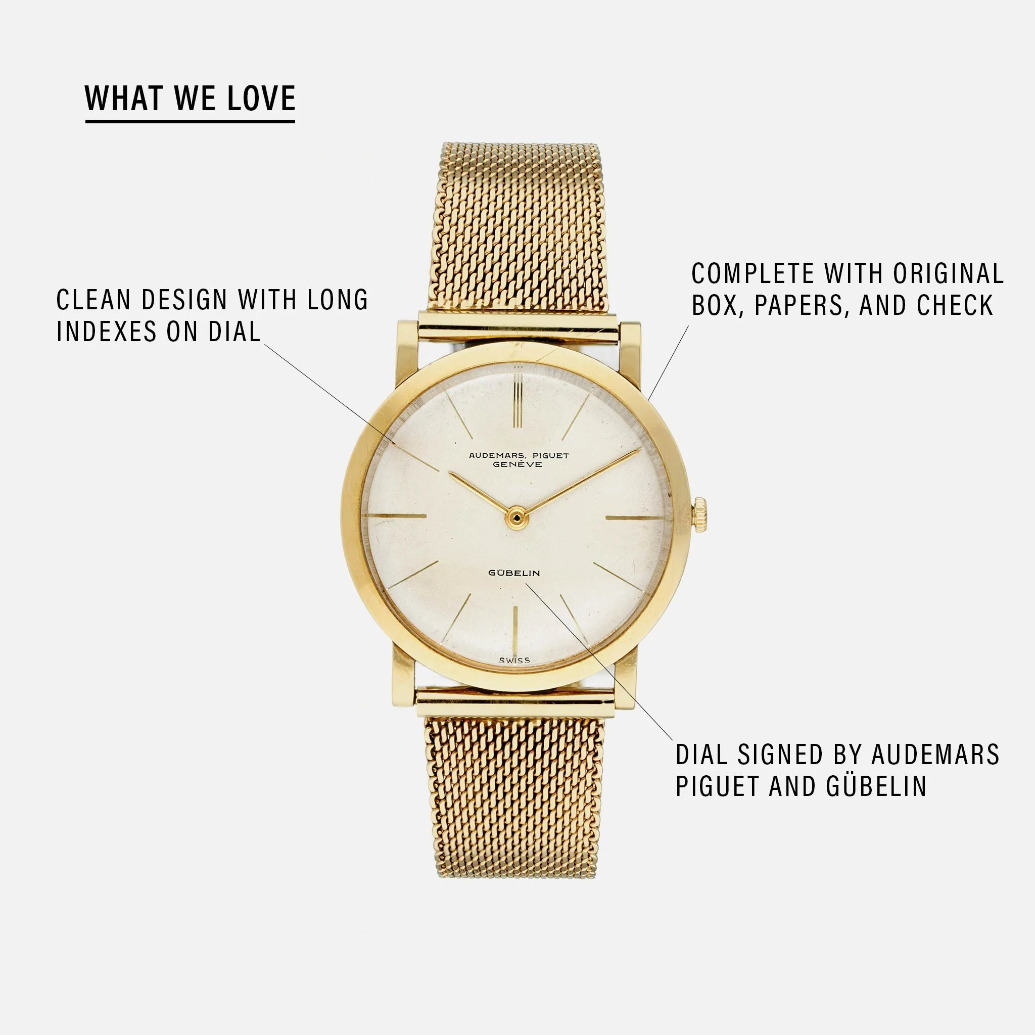 It’s always exciting when you come across a watch with double signature, so imagine our delight when we found this yellow-gold Audemars Piguet ultra-thin wristwatch with the signature of famed Swiss luxury retailer Gübelin. Founded in 1854, the retailer has proudly stamped its name on watches from Patek to Audemars Piguet. The example you see here is a reference 5043 from 1954 (later sold on December 4, 1954, as confirmed by Audemars Piguet). The ultra thin wristwatch is elegantly simple in design, and is powered by a caliber 2003 manual-winding AP movement (developed by Jaeger-LeCoultre and also adopted by Vacheron Constantin). This caliber was, for a while, the thinnest manual-winding movement on the market, measuring less than 2 mm. While the 14k yellow-gold mesh bracelet might not be original to the watch, the box, papers, original invoice, check (for $486.75 in 1954) certainly are. A double-signed wristwatch with complete set? Jackpot.
