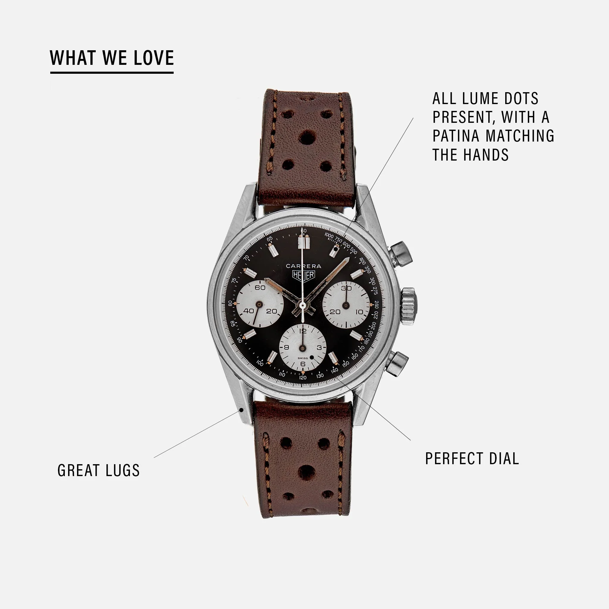 Real Racing Heritage? Check. Killer reverse Panda dial? Check. Gorgeous patina? Check. Simply a fantastic example of one of the most collectible of all vintage sports chronograph, and in a condition that makes it even more of a rarity.