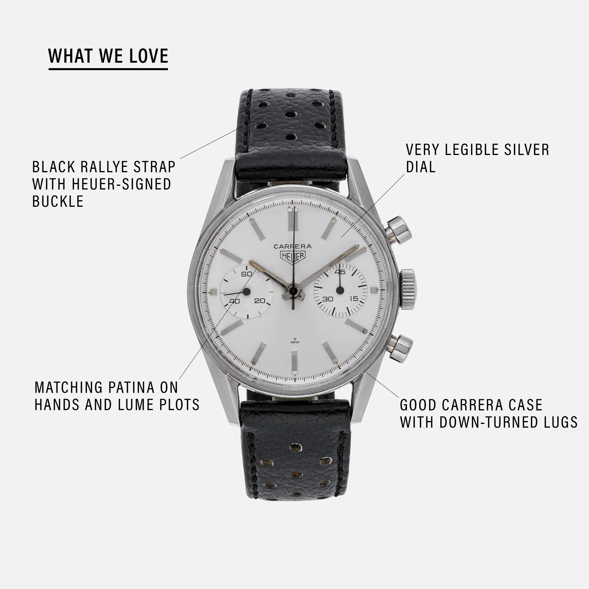 This Carrera has a really good case, with the characteristic down-turned lugs showing a pleasing sharpness. The silver dial is in great condition aside from a small scratch near the index at 2 o’clock. The lume plots are still present, but under a loupe you can see some lume loss on the hour hand. Note that this Heuer comes on a black rallye strap and a Heuer-signed buckle, very much like it was originally presented more than 50 years ago.