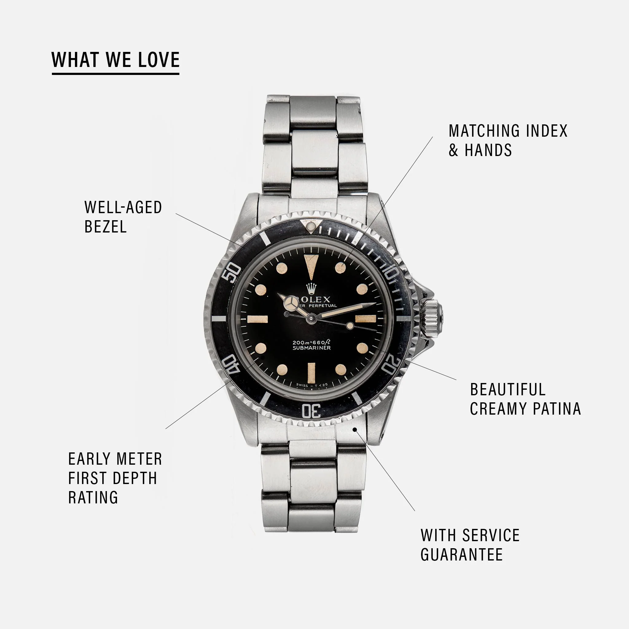 For the Rolex Sub 5513 (or any vintage Sub in general) it’s all about the patina, and this one has just that. The dial on this watch is incredible and the color is a smooth and silky black, just as it should be. The indexes and the hands have faded to the same creamy white and have no blemishes. The case is also in great condition with minimal signs of wear. The only thing to note is the (probable) later bezel insert, and later bracelet, but these are also in good condition with little sign of wear. However, this watch comes with the original box, service paperwork, information card, and original tag – needless to say, this is a fantastic piece.