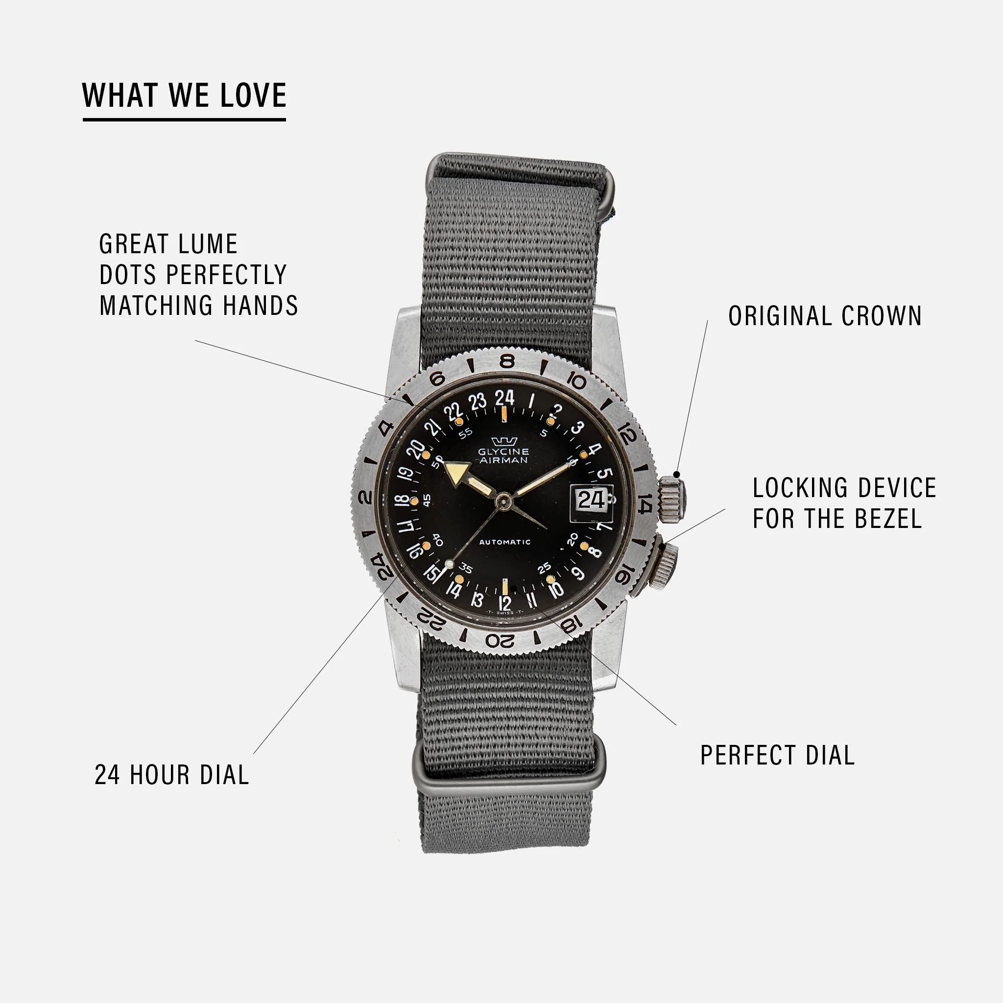 The year 1953 was a big one for horology – think the introduction of the Rolex Submariner – but it was also the year Glycine introduced this innovative travel watch, with a 24-hour dial and a patented lockable 24-hour bezel. Highly functional, the Airman watches were a favorite of US military personnel from the start, especially (of course) pilots. Glycine is a brand that many of you might not have heard of, but it it’s a great brand to discover if you’re into true tool watches. Ideal as both a dual time watch still completely practical for today’s traveler, and as a wonderful link to a brand with an authentic history in aviation.