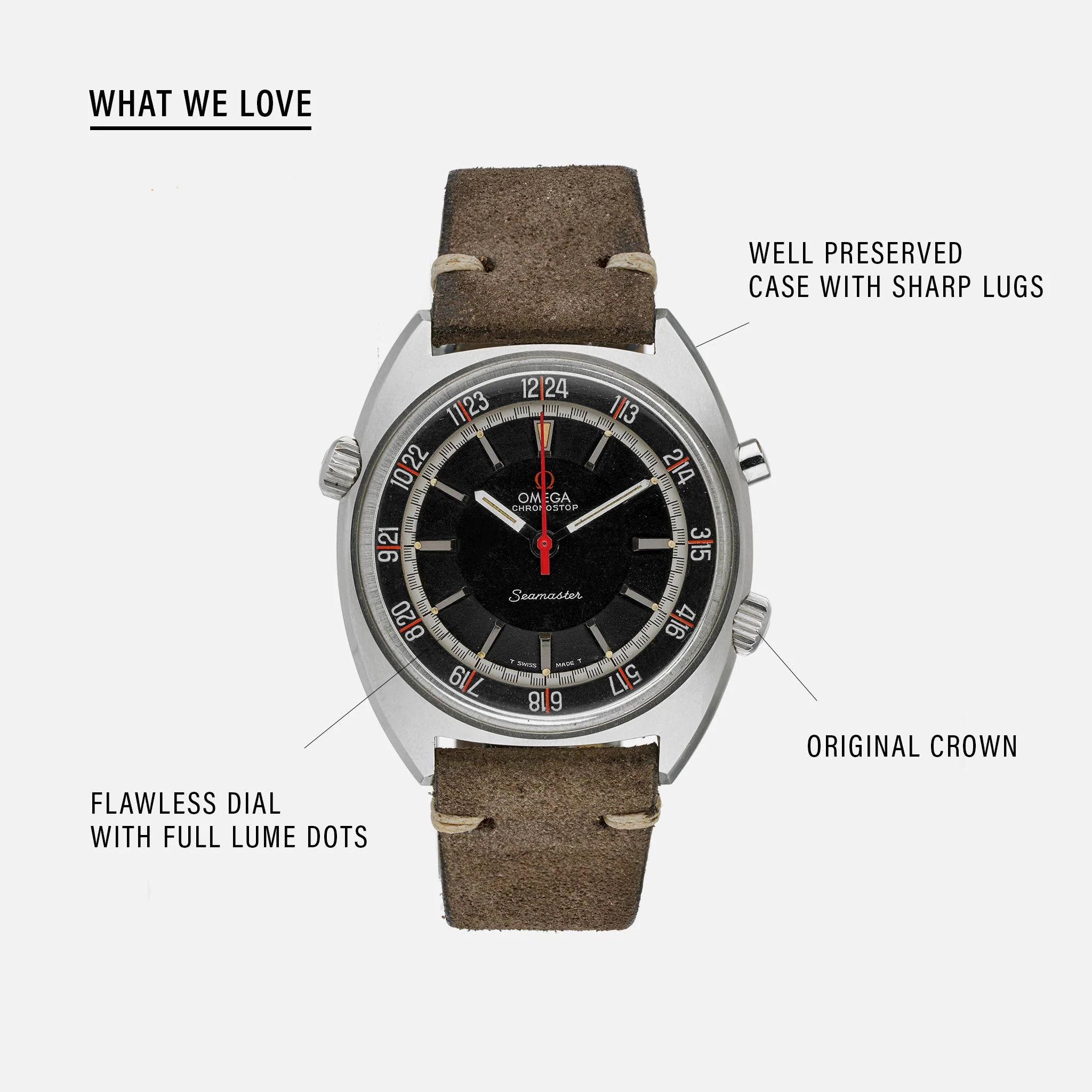 This cool Omega features the caliber 865 movement, a single-button chronograph movement initially introduced in 1966. Although the red hand appears to be the center seconds hand, it is in fact a chronograph hand dedicated to timing short events and to activate this function, you simply press the top pusher, which triggers the timer (and also resets it). In addition to this sporty function, this Omega features a rotating internal 24-hour bezel, similar to that on the Supercompressor of the same time. Not only is this tool watch incredibly functional with its sturdy stainless-steel case, black dial, and red accents, it's attractive as well. Overall, this is a super-cool Omega Chronostop that you don’t see on the market often.