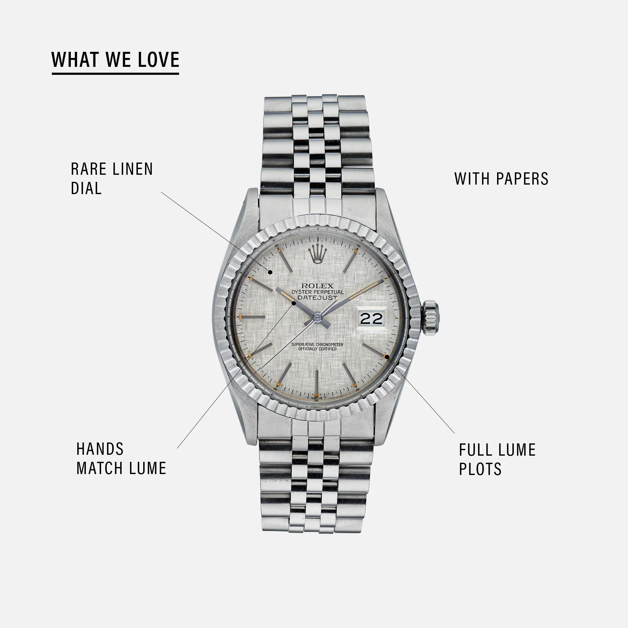 The Datejust is one of the most iconic Rolex watches. It’s been around since 1945 and has been slowly evolving for many decades, in the slow-and-steady, if-it-ain’t-broke-don’t-fix-it fashion so characteristic of Rolex (and which many feel is one of Rolex’s greatest assets). The one you see here is from around 1982, and while it may look like your run-of-the-mill, stainless-steel Datejust with Jubilee bracelet, it isn’t. Take a closer look, and you will see that it is fitted with Rolex’s very refined linen-finish dial, which is not often found in such good condition. The fluted bezel and case edges are wonderfully crisp, and overall, this watch presents extremely well, offering a very handsome variation indeed on the basic Datejust. The original guarantee paperwork is also included; this is a very charming, easy-wearing, and versatile example of a linen-dial Datejust.