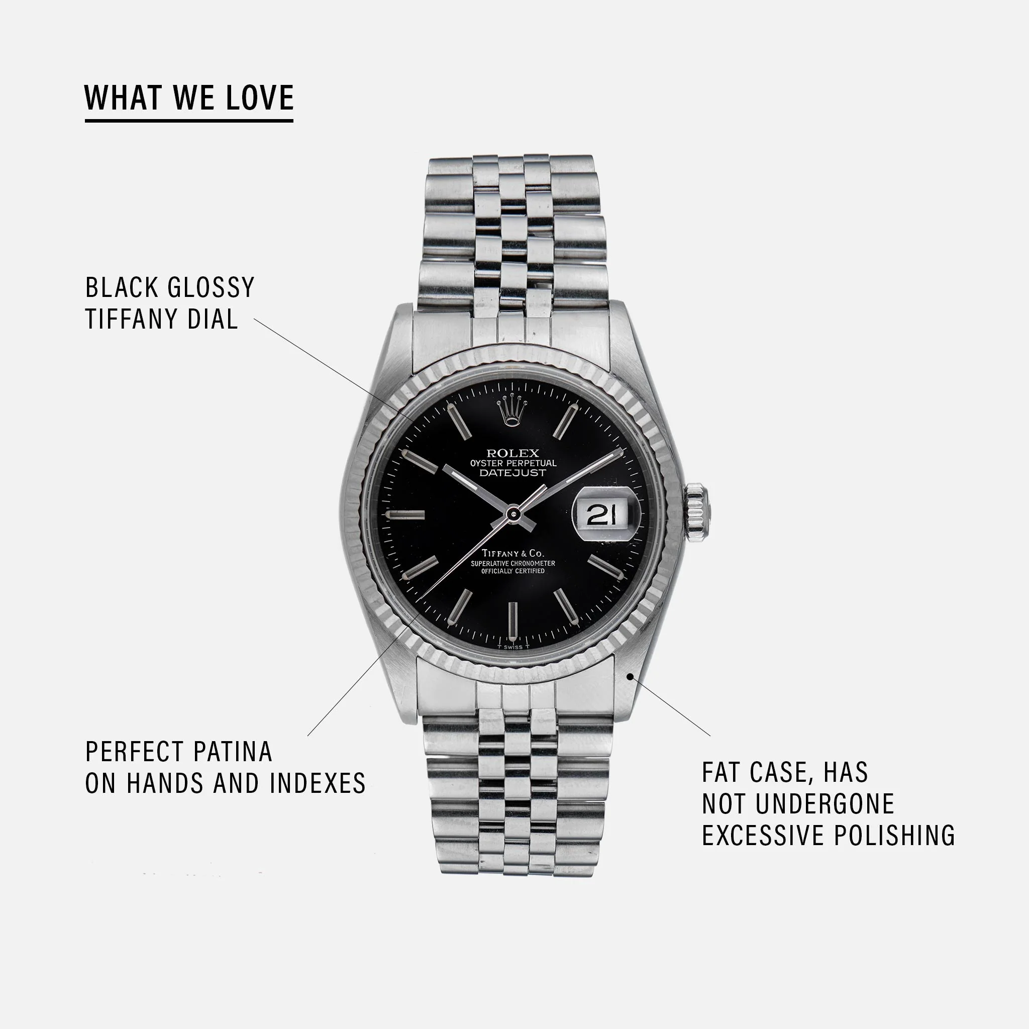 The black glossy dial on this Datejust from 1990 is handsome enough. But that’s not all – it’s double signed and the second name is that of Rolex retailer Tiffany & Co., turning what’s already a very sharp Datejust into something extra special.