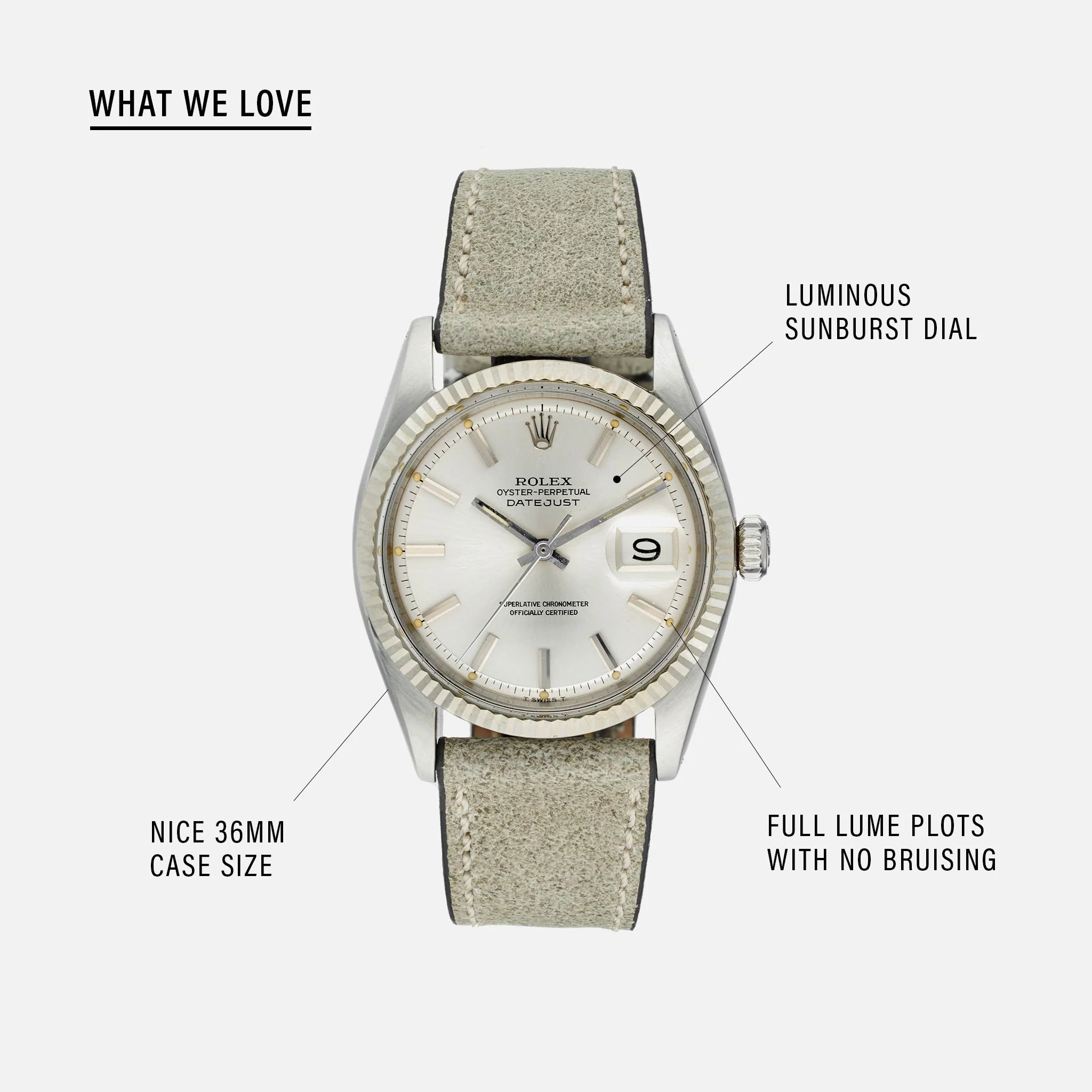 It doesn’t get much better than this Reference 1601. The case is in great condition with the exception of some light scratches underneath the lugs. As expected, the case has been previously polished, and the serial number is slightly worn down between the lugs. The white-gold bezel still has the same sheen that it had when it left the factory. The dial has aged perfectly and has full lume plots. The hands have very minor signs of oxidation but it is only visible through a loupe. Overall this watch is an incredibly nice example of a 1960s Datejust.