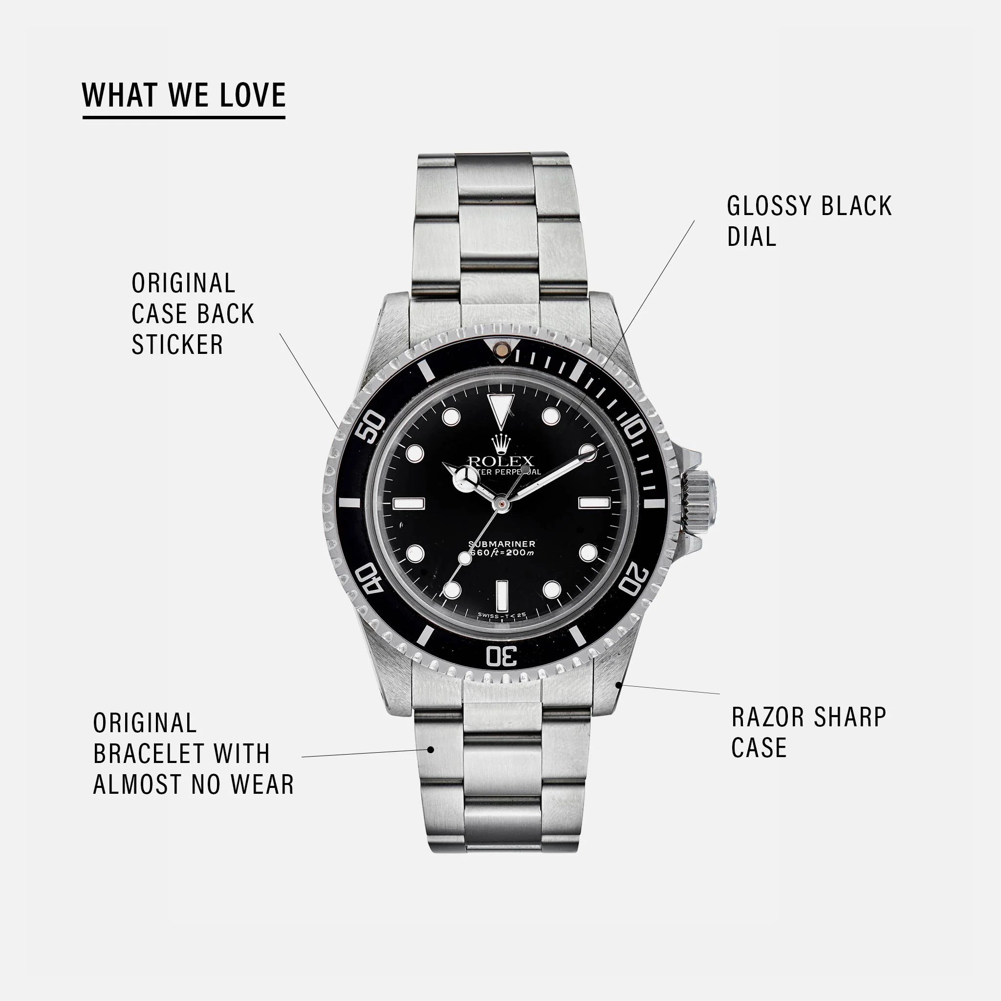The reference 5513 is a much sought after reference. This particular model was made in 1989 and is in exemplary condition, with its slick black glossy dial and very sharp case. There's no crazing to the dial, all edges are clean and crisp; overall, this is one of the cleanest 5513s we’ve seen. This later version is desirable because it is the transitional model between the 5513 and the 14060. The 5513 you see here has the double line, feet-first dial, and the white-gold-surrounded indexes characteristic of the 14060, but the Plexiglass crystal used in the earlier 5513s. The bracelet is in excellent condition, and this watch still has the case back sticker intact as well - we don’t think it’s ever been opened. Additionally, this watch is complete with boxes and papers. We do recommend, as with all vintage dive watches, that you don’t dive with it unless the seals are replaced (and of course pressure testing is essential), but as an example of a near-flawless transitional 5513, we also think that this is about as good as it gets. Simply an irresistibly attractive vintage Submariner.